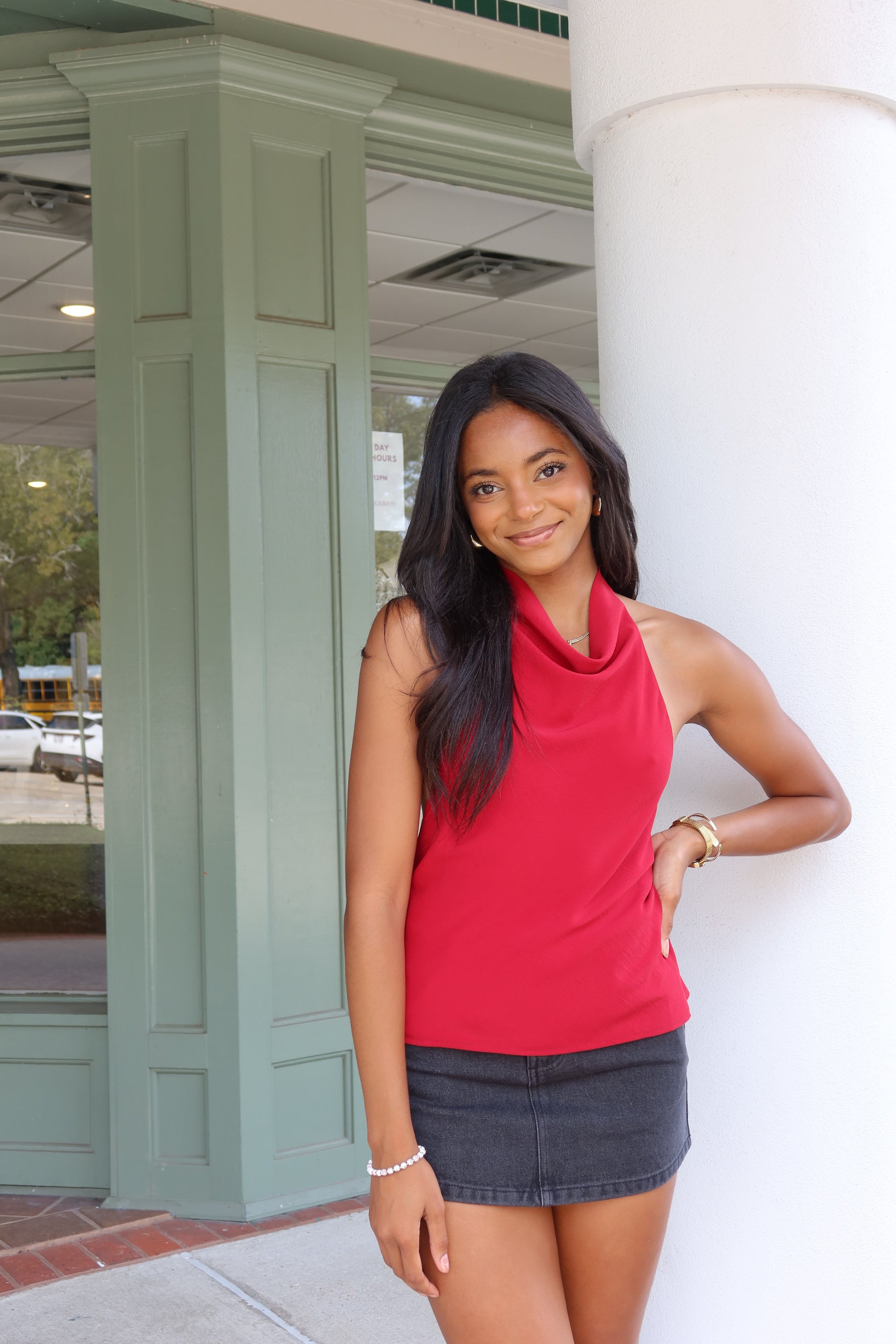 - Our 'Cherry' top features a high cowl neckline, halter/back tie, and open back detailing.