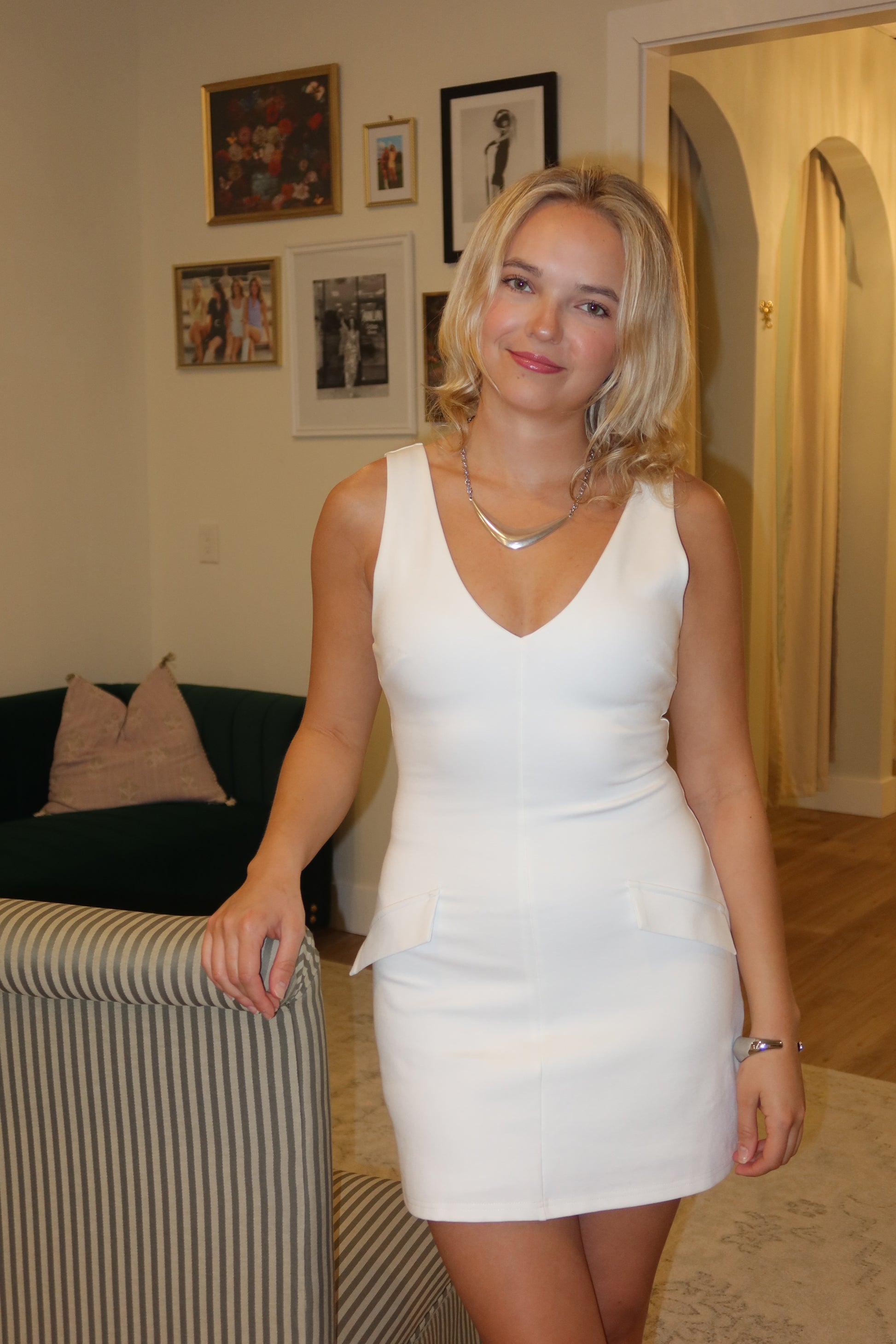 - Our 'Claudia' mini dress features a v neckline, jersey stretch fabric, sleeveless, back zip enclosure, and faux pocket detailing.
