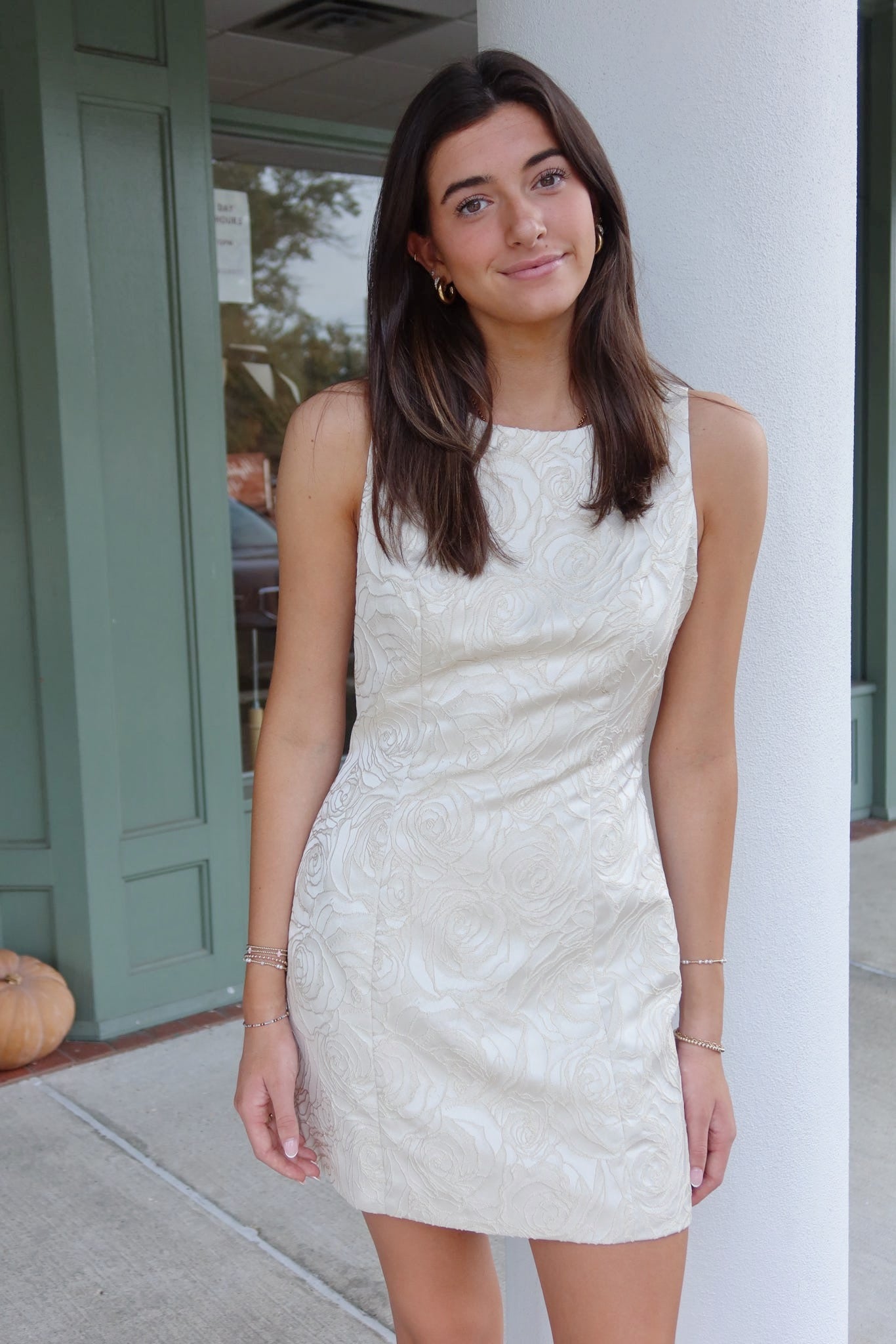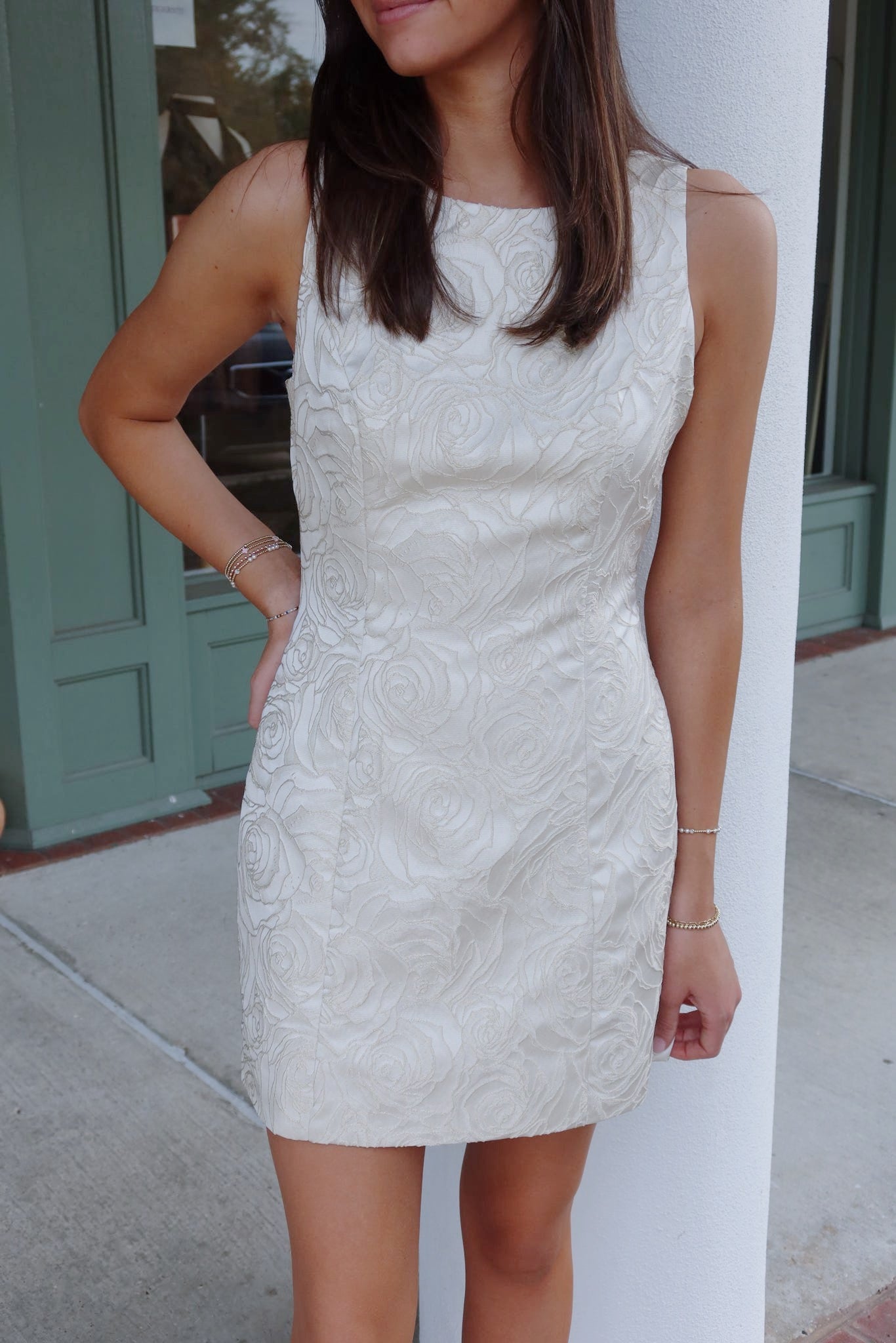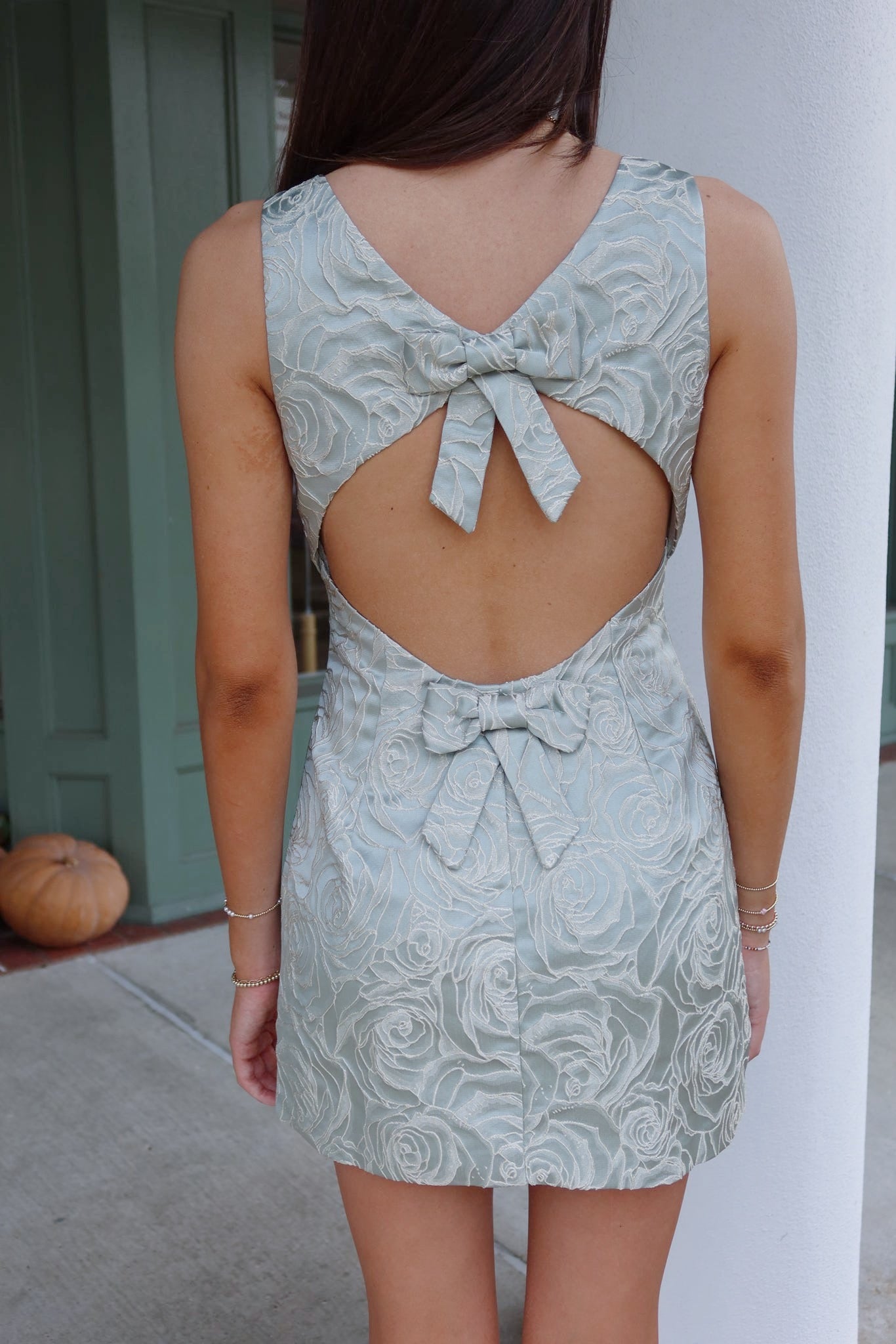 - Our 'Candice' mini dress features a boat neckline, floral jacquard, open back, size zipper, and back bow detailing.