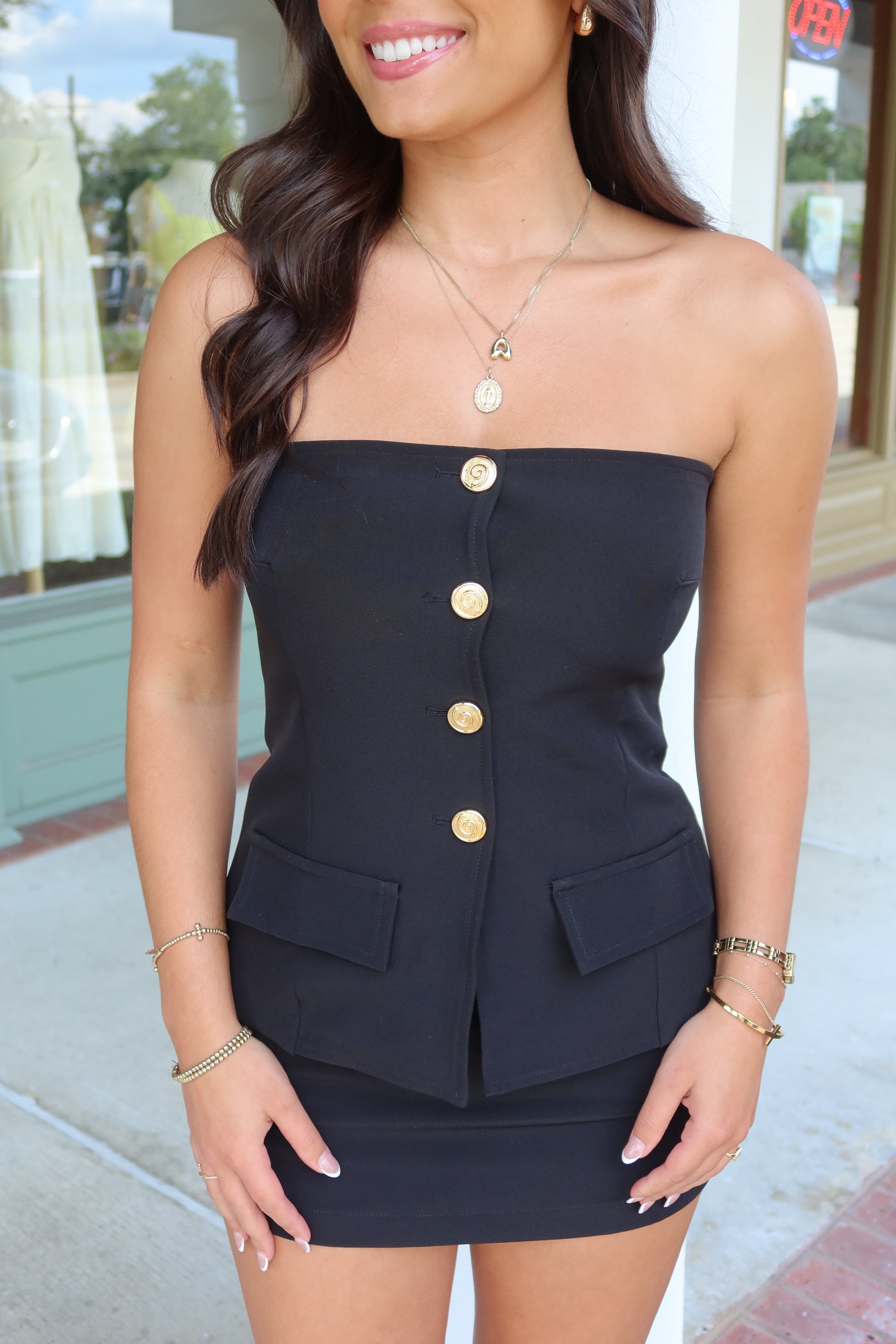 - Our 'Heidi' top features a strapless neckline, gold button down, faux front pocket detailing, with matching skort sold separately.