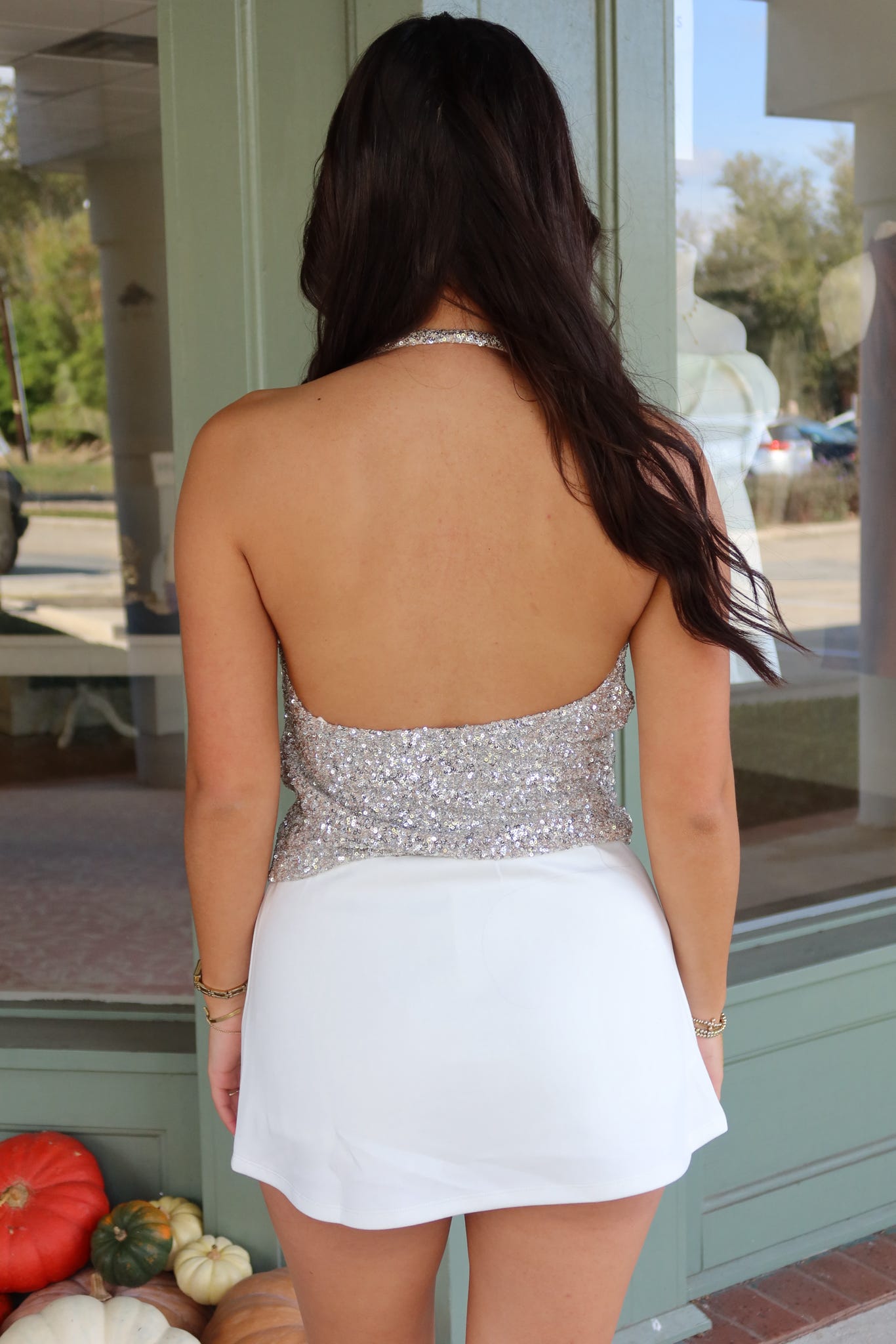 - Our 'Kimberly' top features a low cowl neckline, halter, open back, and all over sequins detailing.
