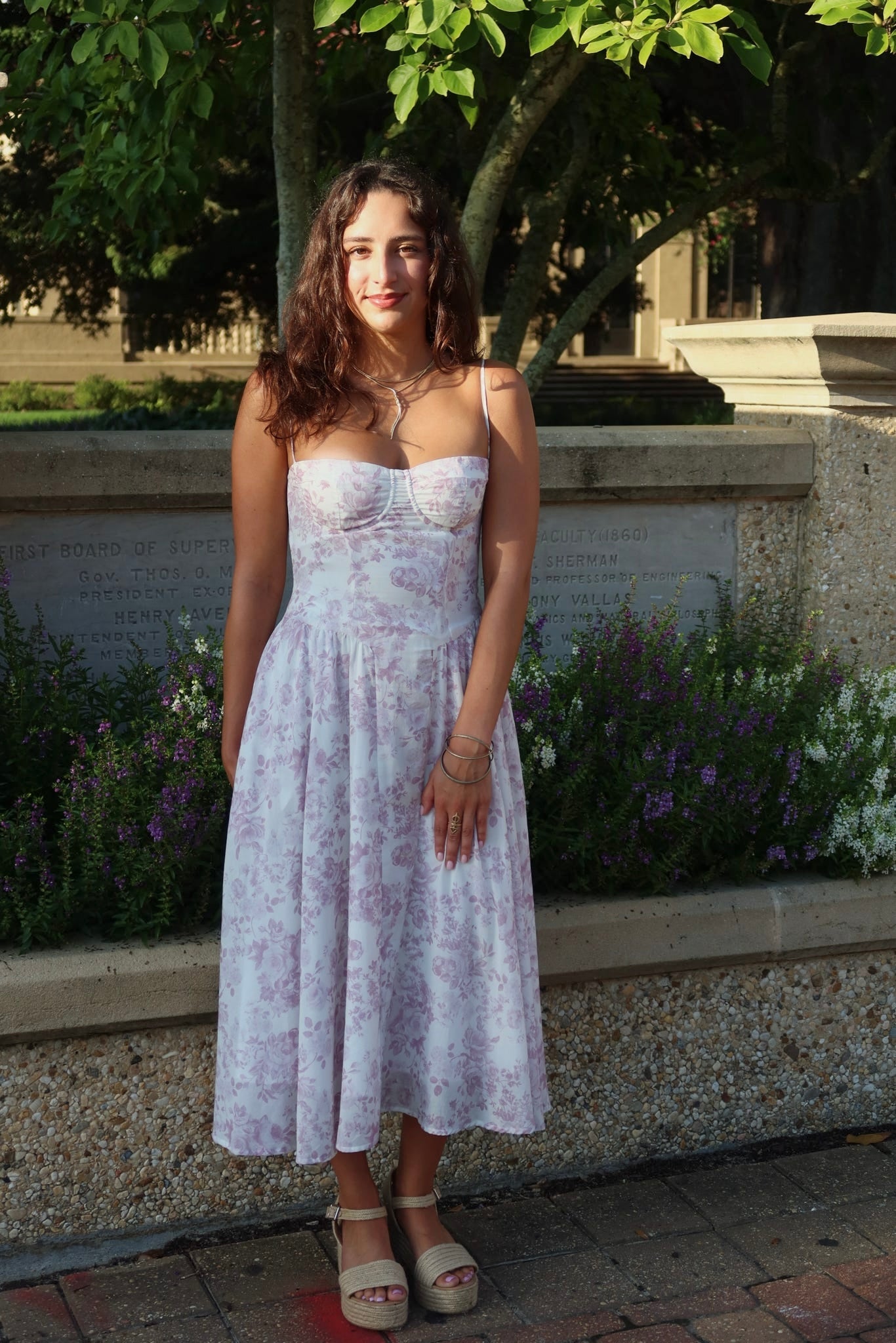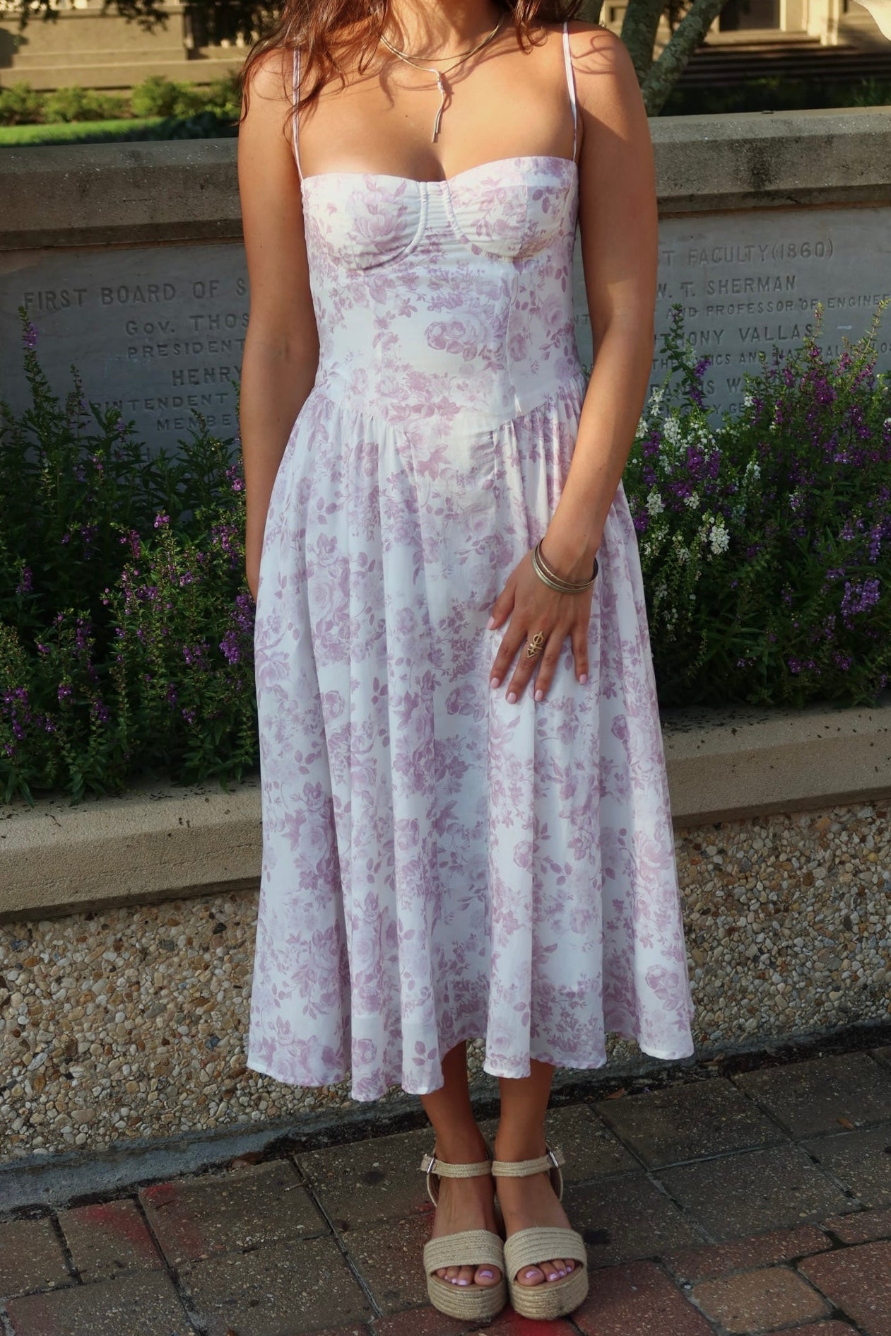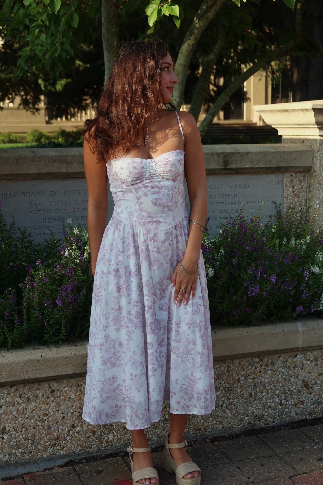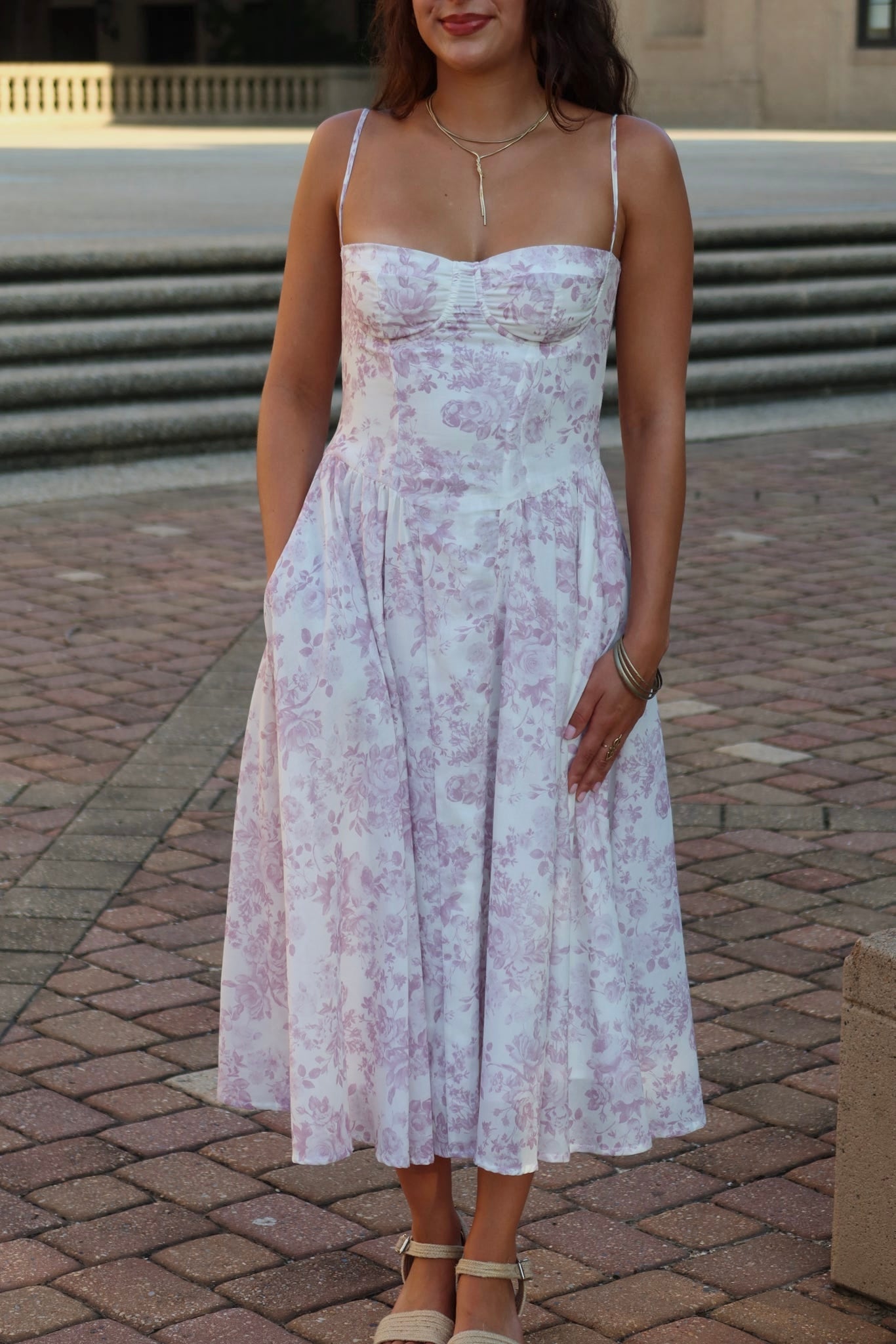 - Our 'Maeve' midi dress features a sweetheart neckline, adjustable straps, side pockets, and allover flower print detailing