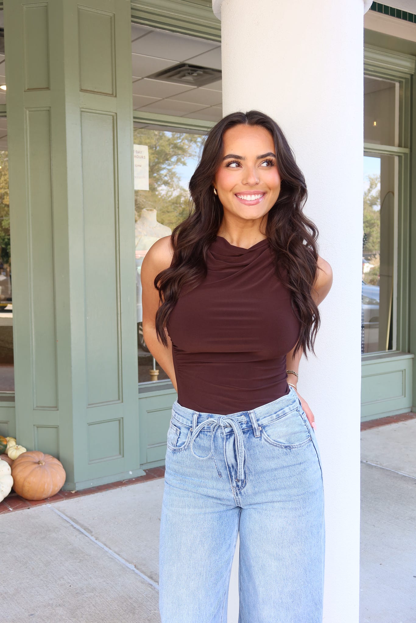 - Our 'Macie' top features an draped neckline, soft stretch fabric, and side ruched detailing sleeveless.
