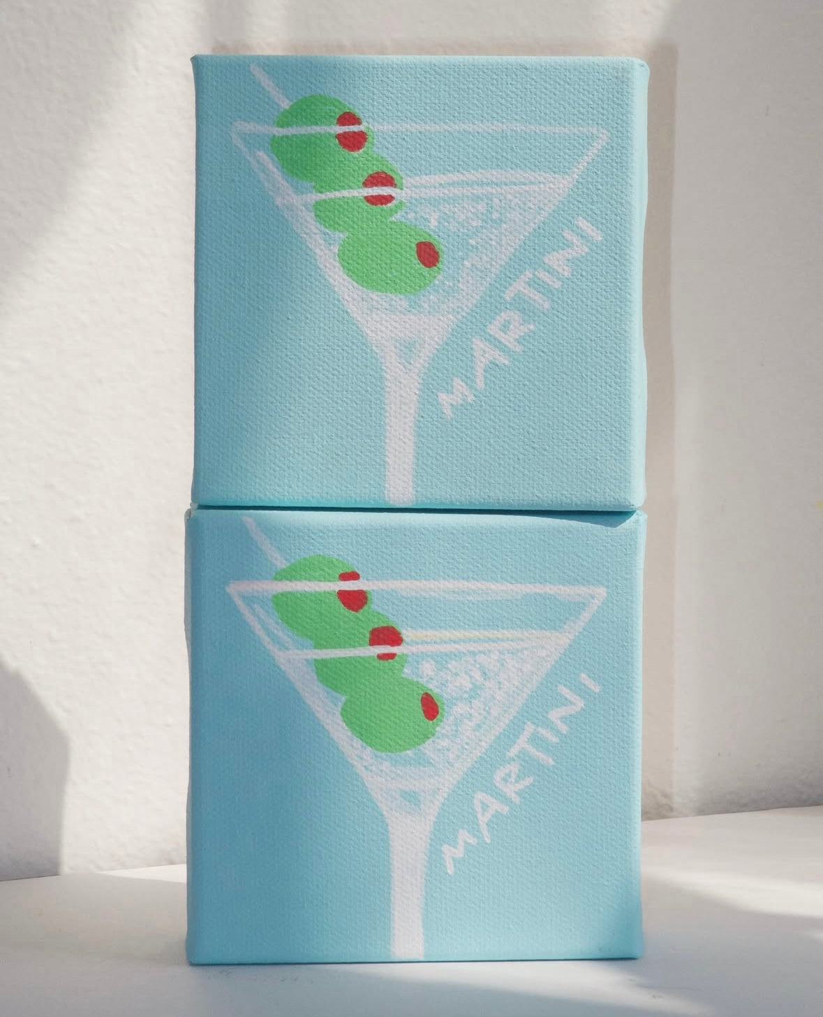 Hand-painted martini mini canvas is the perfect blend of glam — featuring an iconic olive garnish that adds just the right touch of sophistication! Perfect for your bar cart, vanity, or college apartment wall, this piece is made to stand out!
