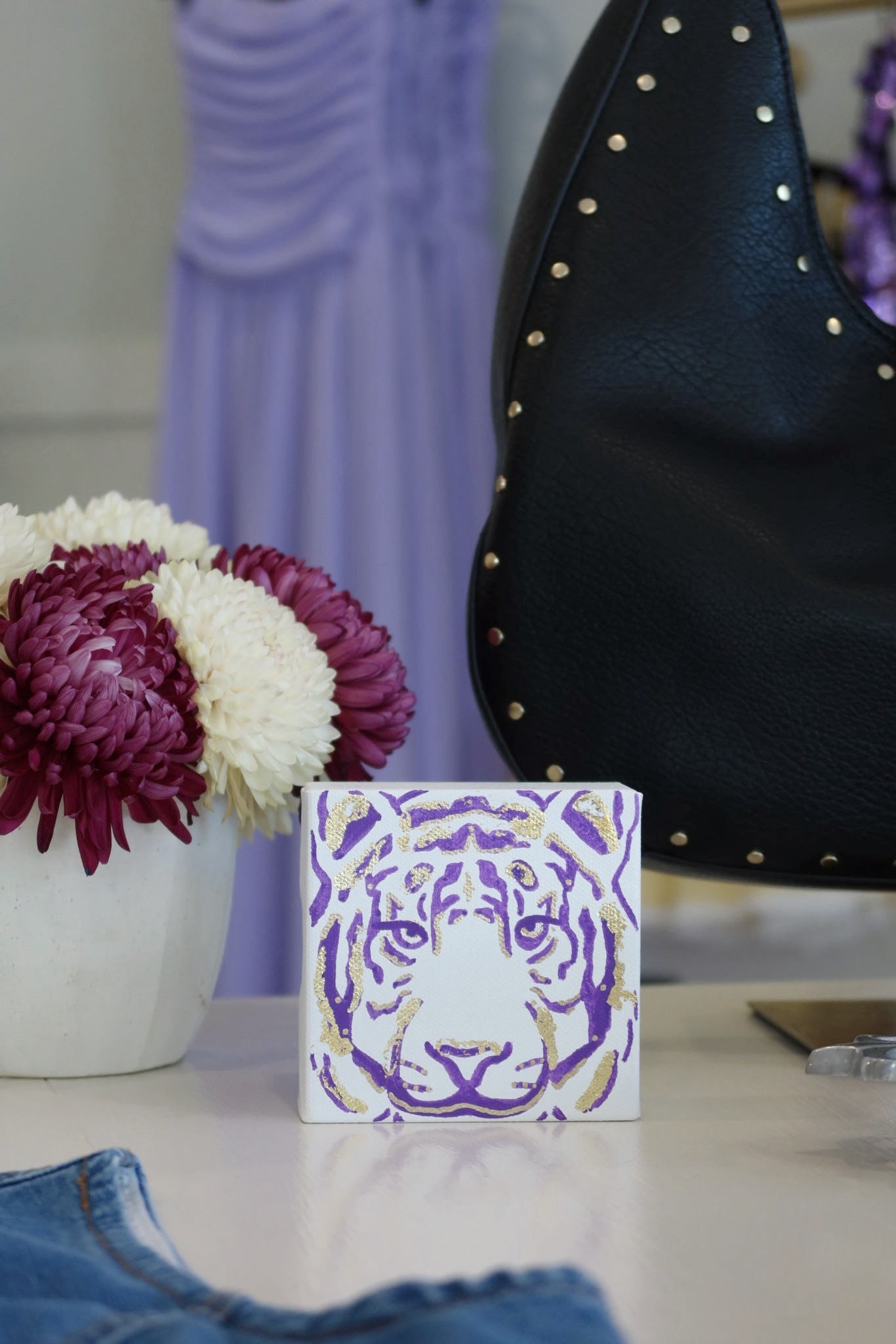 Hand-painted Mike the Tiger mini canvas is a must-have for every LSU girl looking to level up her space! Bold, spirited, and full of Tiger pride, it’s the perfect accent for your college house, dorm, or game day bar cart!