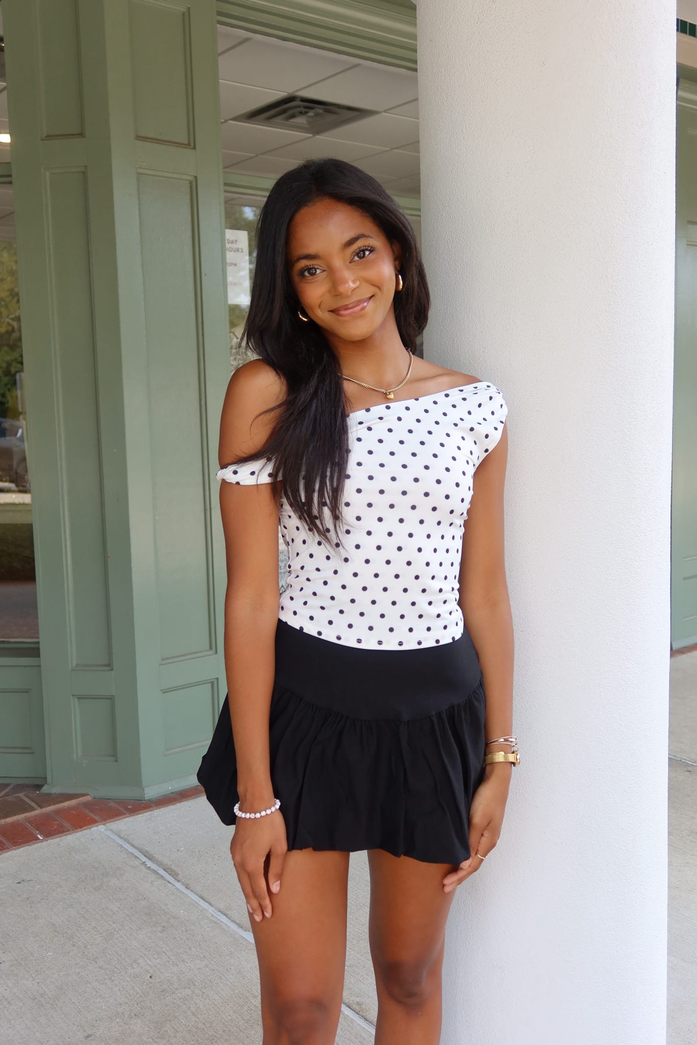 - Our 'Miranda' top features a one shoulder, twist shoulder detail, double lined, and allover polka dot print detailing.