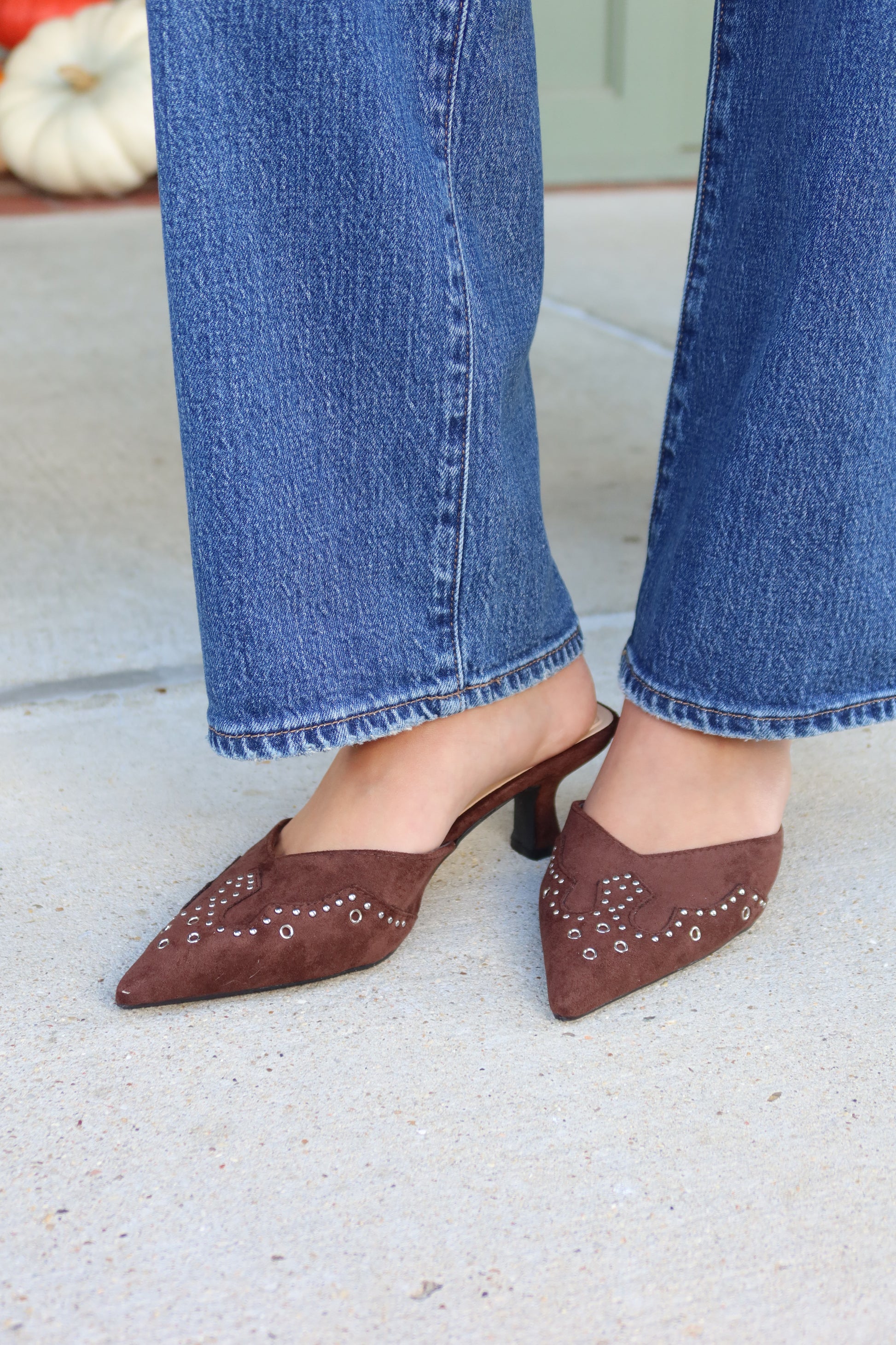 - Our 'Molly' western heels feature a mini heel, pointed toe, padded soles, slip-on heel, suede material, and stud embellishment detailing.