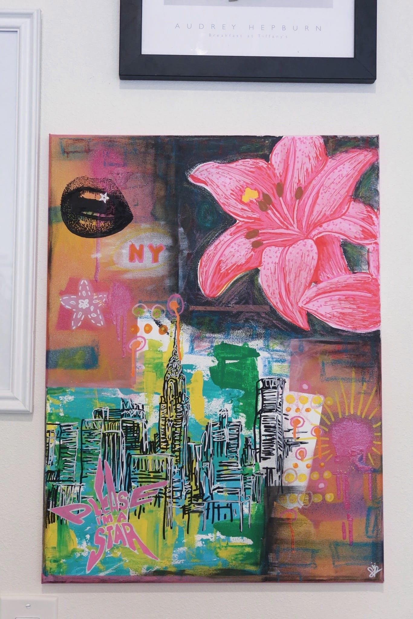 “New York Bloom” is a one-of-a-kind abstract piece that blends the bold outline of NYC’s iconic skyline with the softness of a blooming pink lily! Perfect for adding a touch of elegance and edge to your college house, apartment, or gallery wall!