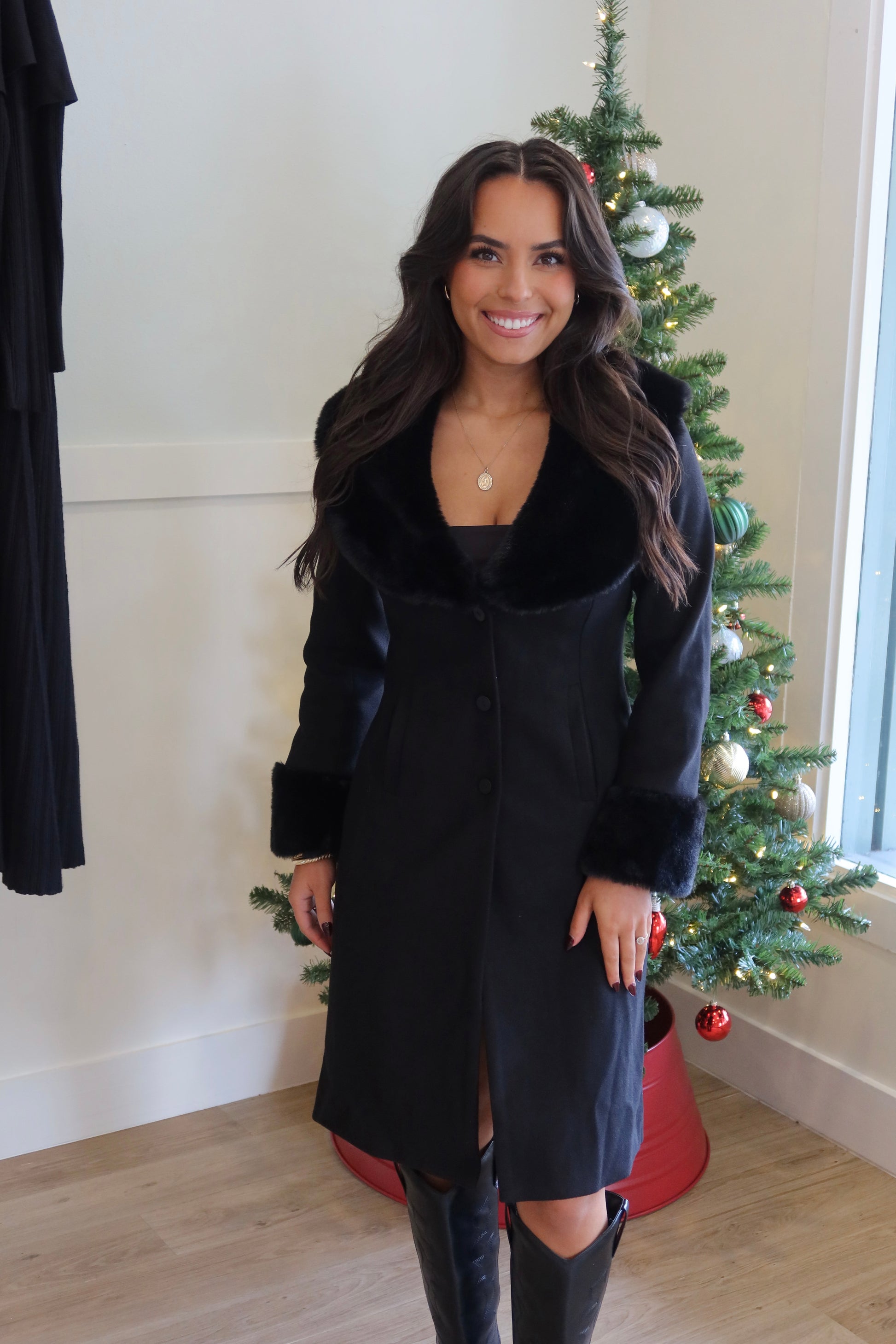 - Our 'Hayley' coat features a v neckline, front button closure, oversized shawl collar, includes pockets, and fur cuff detailing.