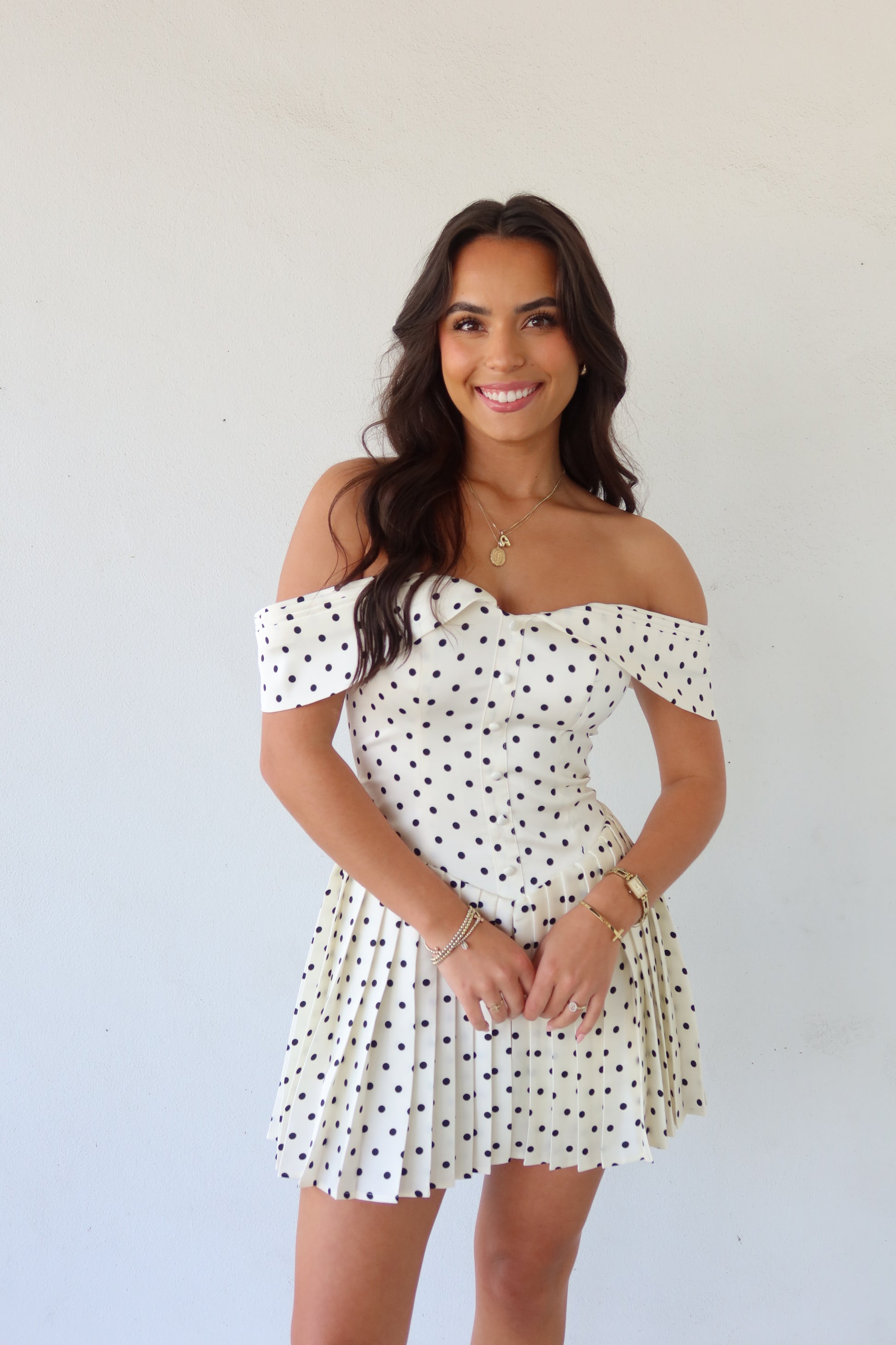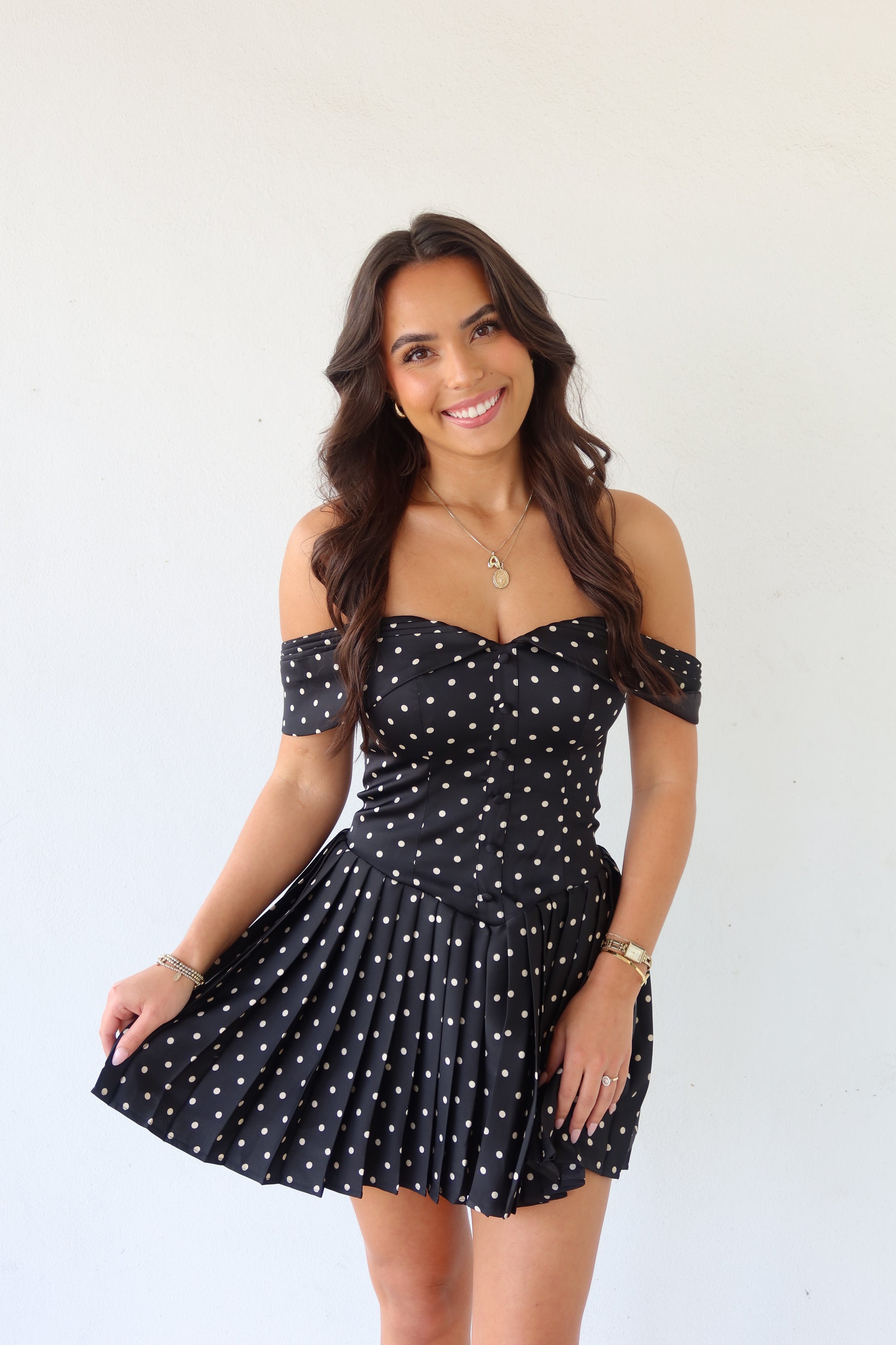 - Our 'Stacey' mini dress features an sweetheart neckline, strapless, draped overlay detail, flare skirt, back zipper, and allover polka dot detailing.