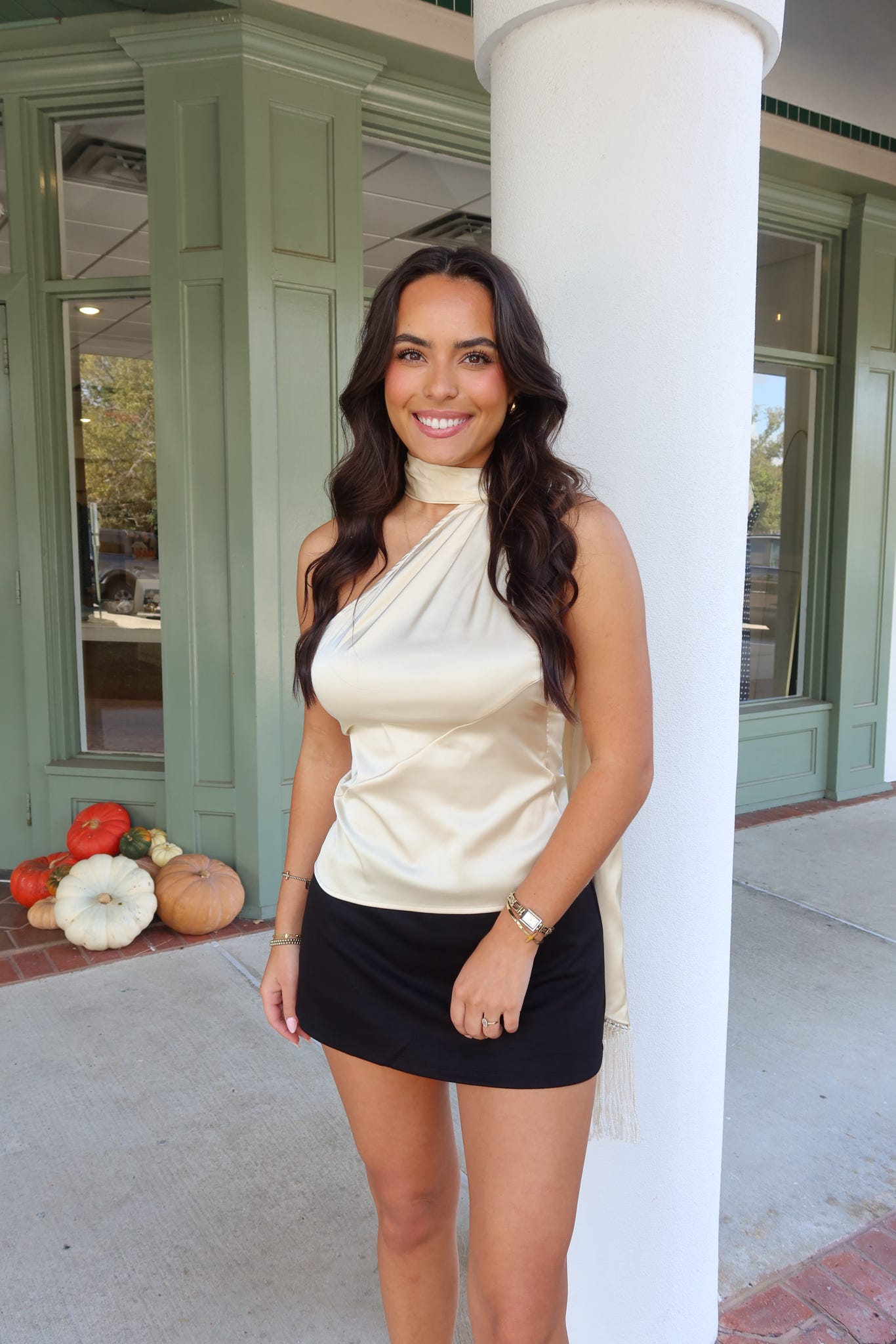 - Our 'Stevie' top features a one shoulder neckline, side zipper, satin fabric, attached scarf, and bead tassel detailing.